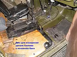 - На ГАЗ-69А один топливный бак, на ГАЗ-69 — два. На автомобильной раме находился фильтр грубой очистки топлива (с отстойником). Фильтр тонкой очистки топлива — на бензонасосе. Померить уровень бензина в основном топливном баке автомобиля ГАЗ-69 водитель мог, не вставая с места (щуп позади рычагов раздаточной коробки). На ГАЗ-69 устанавливался и дополнительный топливный бак — под пассажирским сиденьем. Вентиляция дополнительного топливного бака выведена под пол кузова. Заправка — при открытой пассажирской двери. На панели приборов датчик показывал количество топлива только в основном баке. Узнать, сколько бензина в дополнительном баке, можно, только посмотрев в заправочную горловину. Переключатель топливных баков — на полу водительского места.
