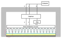 В сцинтилляторе гамма-камеры энергия поглощённых или рассеянных гамма-квантов преобразуется в фотоны видимого излучения, причём количество излученных фотонов пропорционально поглощённой в сцинтилляторе энергии гамма-кванта. Фотоумножители преобразуют световую вспышку в сцинтилляторе в импульс тока, который регистрируется спектрометрической аппаратурой. Амплитуда импульса пропорциональна поглощённой в сцинтилляторе энергии гамма-кванта, поэтому возможно отделение вспышек, вызванных гамма-квантами с энергией, характерной для используемого маркера, от фона. Применение сборки фотоумножителей позволяет осуществить восстановление координат вспышки и, таким образом, измерить пространственное распределение маркера в теле пациента.