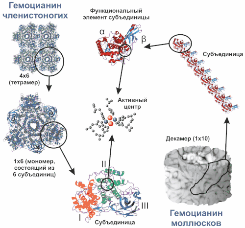 Мономер гемоцианина членистоногих состоит из 6 субъединиц и имеет октаэдрическую форму. У членистонигих гемоцианин представлен в виде мономеров (1×6), димеров (2×6), тетрамеров (4×6), гексамеров (6×6) и октамеров (8×6)[2][4].