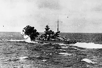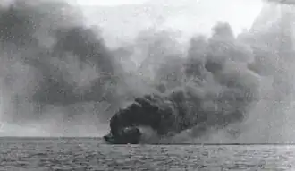 ![]() Вид с линкора «Шарнхорст» на горящий авианосец «Глориес» | |||
