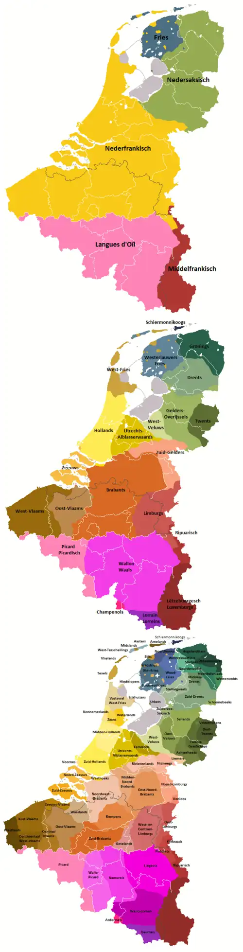 Изначально на территории будущего графства Голландия говорили на древнефризском или родственном ингвеонском диалекте[1]. Нет никаких доказательств теории о том, что причиной перехода на древненидерландский язык в XII-XIII веке была миграция нижнефранкскоязычных поселенцев[2]. Скорее длительный языковой контакт между носителями фризского и франкского языков до XII века мог привести к появлению голландского диалекта, который был преимущественно нижнефранкским, но со значительным влиянием фризского языка[1].