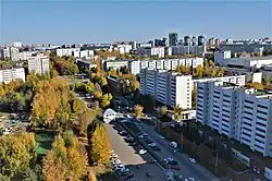 - Вид на Горки-3 и жилой комплекс «Экопарк «Дубрава». На переднем плане — Дом ребёнка в микрорайоне 7А (май 2019)