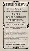 Пансион В. С. Чорн, расположенный у берега моря, имеет 24 хорошо обставленных номера, ценою от 25 до 60 руб. в месяц. Пансион — завтрак из 2 бл. обед из 3 бл. — 40 руб. в месяц. Имеется общий зал с роялью. С октября по июнь комнаты сдаются значительно дешевле[6].