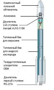 Типы двигателей и других компонентов ракеты могут отличаться, в зависимости от конкретной модификации. В основании ракеты, в нижней части первой ступени размещается жидкостный маршевый двигатель. Выше, в порядке возрастания, расположены топливные баки: бак для окислителя, в качестве которого выступает жидкий кислород, и бак для керосина RP-1. Далее следует промежуточный отсек между ступенями (англ. interstage). У основания первой ступени устанавливаются твердотопливные ускорители. Выше первой ступени находится двигатель и баки второй ступени, над которыми располагается авионика ракеты. Венчает конструкцию полезный груз, обрамлённый головным обтекателем[5].
