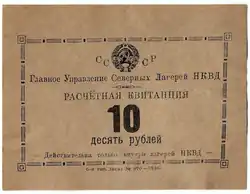 Расчётная квитанция для Северных Лагерей НКВД номиналом 10 рублей.