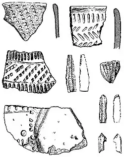 На раннем этапе преобладают микролитоидные кремнёвые изделия: наконечники стрел, вкладыши с притупленным краем, скребки на отщепах и пластинках, проколки. Посуда — остродонная, лепная, глиняная с примесью шамота, дресьвы, толчёных раковин и мелкого кварцевого песка. Обжиг слабый и неравномерный. Поверхность сплошь орнаментирована прочерченными или волнистыми линиями, ёлочкой, круглыми вдавлениями. Некоторые сосуды окрашены в красный или жёлтый цвета.