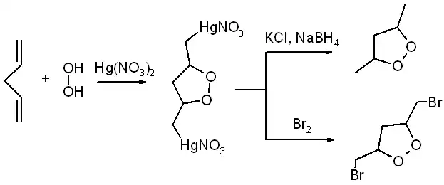 1,2-диоксоланы и их производные является циклическими пероксидами, и поэтому нестабильны: сам 1,2-диоксолан устойчив только до 35 °C. Его производные легко разлагаются при нагревании и облучении[8]. Их получают по следующим схемам: