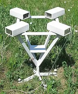 Дисдрометр ударного типа: вертикальный цилиндр — ударный датчик, подключённый к блоку обработки данныхОптические дисдрометры — для анализа в качестве источника излучения используют лазерные диоды или другие источники излучения. В качестве приемников — светочувствительные элементы. Это позволяет замерять количество и размер капель, пролетевших между датчиками, а в случае снега — даже конфигурацию отдельных снежинок. Некоторые оптические приборы (2D-видеодисдрометры) могут записывать и обрабатывать видеоданные о гидрометеорах, пролетающих в зоне действия датчиков