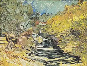 Винсент Ван Гог написал полотно «Дорога в Сен-Реми с женской фигурой» во время своего пребывания в больнице для душевнобольных Сен-Поль в Сен-Реми-де-Прованс в 1889 году. Отличительный стиль живописи более поздних работ Ван Гога очень очевиден в этой картине, так как дорога, растительность и небо все отрисованы его толстым характерные мазки.