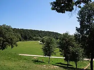 Вид со смотровой площадки на Певческое поле и камень в память о Марине Цветаевой