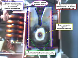 Дугогасительная камера сконструирована таким образом, что электрическая дуга, образующаяся при размыкании контактов коммутационных аппаратов, втягивается в дугогасительную решётку, так как такое движение плазмы энергетически выгодно. Втянувшись в промежутки пластин камеры, электрическая дуга удлиняется, разбивается пластинами камеры на несколько более маленьких по длине дуг, при этом быстро деионизируется, охлаждается и гаснет. В дугогасительных камерах с магнитным дутьём, осуществляемым с помощью дополнительного магнитного поля, создаваемого с помощью постоянных магнитов или электромагнитов, плазма дуги эффективнее втягивается в дугогасительную камеру воздействием на неё магнитного поля, порождаемого этими магнитами, так как плазма из-за высокой электропроводности стремится вытолкнуться из магнитного поля, сохраняя поток магнитного поля внутри себя неизменным. Благоприятным дополнительным фактором взаимодействия с ферромагнитной решёткой, который влияет на движение ряда малых дуг (полученных при разбиении большой дуги) — это выравнивание их скоростей: вырвавшиеся вперёд дуги будут тормозиться, а отстающие — ускоряться, исключая выход их с внешней стороны решётки и втягивая дугу при малых токах в дуге.