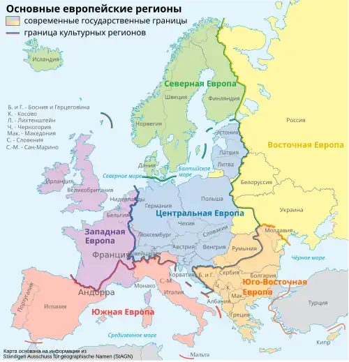 Культурно-исторические регионы Европы по определению профессора П. Джордана, опубликованному в германском журнале «Европа регионал» в 2005 году