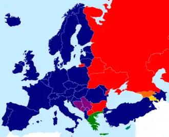 В советское время деление Европы на Восток и Запад имело зачастую политическую окраску — к Восточной Европе относили ГДР, Польшу, Чехословакию, Венгрию, Румынию, Болгарию, Албанию, Югославию и СССР — страны социалистические, или, как их ещё называли, «страны народной демократии». К Западной Европе относились все остальные государства. При этом Испания, Португалия, юг Франции, Италия, Мальта, Кипр, Греция и Турция также назывались Южной Европой, а Исландия, Норвегия, Швеция, Дания и Финляндия — Северной[47].