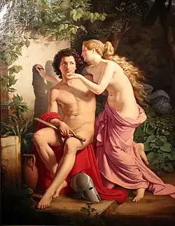 Вильям-Адольф Бугро. Рождение Венеры. 1879. Музей Орсе, Париж. Пример картины мифологического жанраМифологическая живопись — жанр, включающий произведения, посвящённые героям и событиям мифов древних народов. Как и батальная, мифологическая живопись примыкает к исторической, она получила оформление в эпоху Возрождения с усилением интереса к античной мифологии (характерный пример — «Рождение Венеры» Сандро Боттичелли, картина написанная около 1484 года). В XIX—XX веках стали чаще появляться произведения на темы германской, кельтской, славянской и индийской мифологии[17].