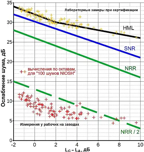 При разработке стандартов РФ, гармонизированных с западными, были взяты за основу устаревшие и некорректные методы прогнозирования, и три последних способа (SNR, HML и расчёт по октавам) попали в ГОСТ РФ[16]; а современные западные стандарты в РФ не используют[31][32]. На иллюстрации справа показано, что ослабление шума у работника, своевременно и правильно использующего сертифицированные вкладыши, не имеет ничего общего с результатами "прогнозирования" по методикам[16].