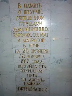 Создана О. Р. Монферраном в 1828 году. После пожара 1837 года восстановлена А. П. Брюлловым почти без изменений. Интерьер лестницы выполнен в классическом стиле, богато декорирован гризайльной живописью. В советское время стала называться Октябрьской в память о событиях октября 1917 года, когда отряды штурмующих проникли по ней в Зимний дворец. По этой же лестнице в 3 часа ночи с 25 на 26 октября 1917 года выводили захваченных министров Временного правительства.