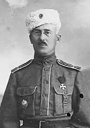 За то, что в бою в ночь на 30 июня 1916 года за укрепленную позицию турок к западу и северо-западу от с. Мусад-Куми (высота 3250), находясь в должности начальника штаба боевого участка, под сильным ружейным и артиллерийским огнем противника произвел разведку укрепленной неприятельской позиции. На основании данных добытых разведкой, составил план действий отряда и принимая самое деятельное участие в выполнении этого плана, способствовал нашим частям одержать решительную победу над превосходным противником. При преследовании турок 21-го июля лично повел две сотни в атаку и несмотря на губительный огонь противника ворвался в г. Байбурт, рассеял отступающие турецкие колонны и захватил пленных.