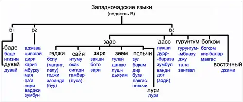 - ↑ Newman P. 36. Hausa and the Chadic Languages // The World’s Major Languages / Edited by B. Comrie. — Second Edition. — London: Routledge, 2009. — P. 619 — Table 36.1 The Chadic Language Family (Inventory and Classification). — ISBN 0-203-30152-8.