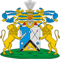 В щите разделённом перпендикулярно на две части, от нижних углов к середине означено чёрное стропило с двумя на нём серебряными стрелами остриями вверх. Над стропилом в правом голубом поле видна выходящая из облака рука в серебряных латах с саблей (польский герб Малая Погоня). В левом серебряном поле крестообразно положены шпага и копьё, остриями в правую сторону. На середине щите и внизу по сторонам стропила изображены три шестиугольных звезды переменных с полями цветов. Под стропилом в золотом поле идущий по земле направо лев.
