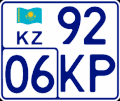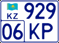 С конца 2012 года мотоциклам выдаётся новый формат номеров. Номер представляет собой квадратную пластину, в верхнем левом углу изображён флаг Казахстана с подписанным под ним кодом «KZ»; в нижнем левом углу в отдельном окне — цифровой код региона. В верхнем ряду помещаются две цифры, в нижнем — две буквы.