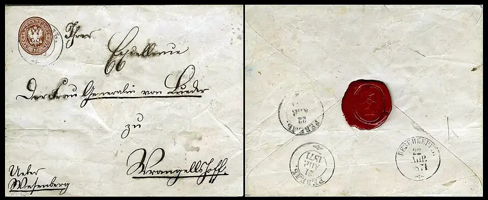 | Штемпельный конверт, отправленный из Ревеля в Везенберг (1871; лицевая и обратная стороны конверта) | |