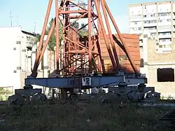 Представляет собой секционную конструкцию трёхгранного сечения. Два пояса, примыкающие к башне, выполнены из швеллеров и служат ездовыми для катков, третий пояс и раскосы выполнены трубчатыми. Имеет собственные механизмы (обойму монтажного полиспаста) для подъёма верхней части башни при её наращивании. Для перемещения, подъёма или опускания самой стойки предназначен полиспаст в нижней части стойки. В нижней части также имеются двухбарабанная лебёдка, один барабан которой служит для навивки монтажного каната выдвижения башни, второй для подъёма и опускания самой стойки. Для проведения пусконаладочных работ и монтажных стойка оборудована специальной люлькой, являющейся рабочим местом монтажника[6].