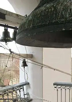 Основное здание соединено трапезной с невысокой трехъярусной колокольней, на которой также небольшая главка. Скорбященский придел асимметрично выделяется по левой стороне от центрального входа.