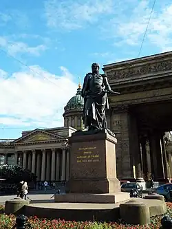 В 1837 году в честь двадцать пятой годовщины разгрома Наполеона на полуциркульной площади перед Казанским собором были торжественно открыты бронзовые памятники прославленным русским полководцам Михаилу Кутузову и Михаилу Барклаю-де-Толли. Автором проекта парных постаментов стал русский архитектор Василий Стасов, а фигуры полководцев были отлиты по моделям скульптора Бориса Орловского. Монументы подчёркивали мемориальное значение Казанского собора как своеобразного памятника подвигам, совершённым русскими воинами во имя Отечества[25].