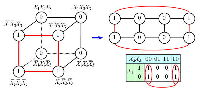 Булевы функции N переменных, представленные в виде СДНФ или СКНФ, могут иметь в своём составе не более чем различных термов. Все эти элементарные термы можно представить в виде некоторой структуры, топологически эквивалентной -мерному кубу, причём любые два терма, соединённые ребром, пригодны для склейки и поглощения.