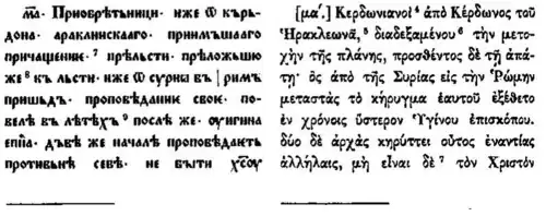 О Кердоне писали многие христианские авторы: св. Ириней Лионский в книге «О ересях» (книга первая, глава XXVII, и книга третья, глава IV); св. Ипполит Римский в труде «Философумены» (книга VII, главы 29 и 37); св. Феодорит Кирский в сочинении «Еретические басни» (книга I, глава 24); св. Епифаний Кипрский в трактате «Панарион»; Тертуллиан в книге «Против Маркиона».