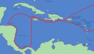 - 24 апреля 1494 года — оставив в Ла-Изабелле гарнизон под командой младшего брата Диего, Колумб повёл три небольших корабля на запад вдоль юго-восточного побережья Кубы.