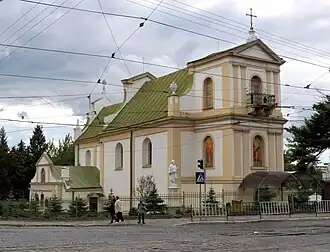 Небольшое однонефное здание не сохранило первоначального вида, который был нивелирован перестройками XVIII века. Притвор с колокольней на нём сооружены в 1798 году по проекту К.Фессингера. В нишах притвора находились фрески Л.Долинского, затёртые позднейшими перерисовками.