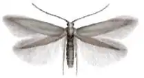 Взрослые бабочки мелкие (4-6 мм в длину и 6-10 мм размахе крыльев), очень узкие, серебристо-коричневого цвета. У них отсутствуют оцеллии и максиллярные щупики. Крылья дискальные, заостренные, с бахромой или «рваные». Имаго летают с мая по июль[7]. Голова серая; усики серо-беловатые, очень нечетко окольцованы серым. Передние и задние крылья серые[8].