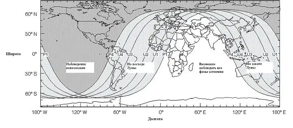 Все фазы затмения P1-U1-U2-U3-U4-P4 (полутеневое, частное и полное) наблюдались в Центральной Азии и части Африки.