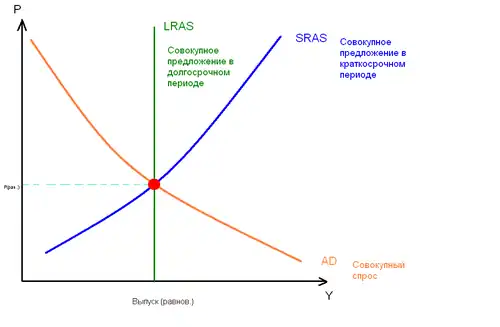 Функция совокупного выпуска определяет кривую совокупного спроса (eng. Aggregate Demand —- AD). Точка пересечения кривой совокупного спроса с кривыми совокупного предложения (AS) (в краткосрочном и в долгосрочном периоде) показывает равновесие в экономике: равновесные уровень цен и значение совокупного выпуска.