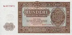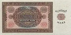 После Второй мировой войны побеждённая союзниками Германия была разделена на четыре зоны оккупации: американскую, британскую, французскую и советскую. В западных зонах 20 июня 1948 года в одностороннем порядке была введена Немецкая марка (ФРГ) (нем. Deutsche Mark). В качестве ответной реакции 24 июня 1948 года в советской зоне была учреждена своя денежная единица. Немецкая марка (нем. Deutsche Mark) советской зоны (позже ГДР) в 1974 году была переименована в марку ГДР (нем. Mark der DDR) и просуществовала до 1990 года[2].