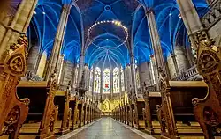 Внутри церкви находятся дубовые скамьи, украшенные гербами благодетелей. Общая вместимость здания — 1800 мест.