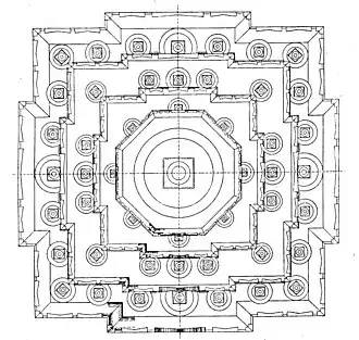 План основания храма квадратный и имеет размеры 13,7 метра с каждой стороны, а уровень основания — 3,7 метра над землей.[3] Храм высотой 26,4 метра обращен к северо-западу. Лестница, выходящая с северо-западной стороны квадратного возвышенного основания, украшена статуей Макара по обеим сторонам, сторона лестницы высечена с барельефом из басни Джатака, повествующей о животной истории буддийского учения. Квадратная терраса, окружающая тело храма, предназначалась для прадакшины или обходного ритуала, идущего по часовой стрелке вокруг храма. Наружные стены украшены барельефы бодхисатв (буддийские божества), такие как Авалокитешвар, Майтрей, Cunda, Кшитигарбх, Самантабхадры, Mahakarunika Avalokitesvara, Ваджрапаните, Манджушрите, Акашагарбх и Боддхисатвадеви Праджняпарамите среди других буддийских фигур. Первоначально храм имел две палаты, небольшую палату спереди и большую главную палату в центре. Крыша и некоторые части стен передней камеры отсутствуют. Верхняя часть крыши отсутствует, предполагается, что она имеет вершину ступы с размерами и стилем, вероятно, такую же, как в храме в Содживане. Внутренняя стена передней камеры украшена барельефом Харити, окруженным детьми, Атавакой с другой стороны, Калпатару, а также группами божеств дэватов, летящими в небесах.