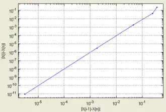 Согласно способу практического определения скорость сходимости может быть оценена как тангенс угла наклона графика сходимости, то есть в данном случае равна двум.