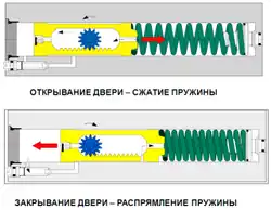 - Пружинная. Устаревшая технология, которая не учитывает изменение момента в процессе открывания двери.