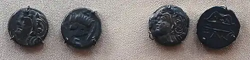 - Одна монета типа «голова сатира влево — лук и стрела влево, ПАN», представляющая собой перечеканенный экземпляр[1].