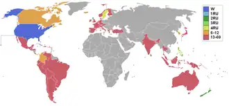 Антигуа, Барбадос, Бопутатсвана, Сальвадор, Фиджи, Маврикий, Португалия, Южная Африка, Сент-Китс, Сент-Винсент, Суринам, Транскей