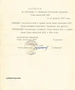 Реабилитирован Верховным судом БССР 29 декабря 1954 года. Постановлением заседания Президиума Правления Союза писателей БССР от 21 февраля 1957 года восстановлен посмертно в правах члена Союза писателей БССР с 1934 года.