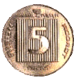 5 прут | 20 | 3,2 | Аверс: четырёхструнная лира; текст «Израиль» на иврите и арабском языке; Реверс: цифра «5»; текст «прута» и год выпуска на иврите; две стилизованных ветви оливы по кругу. |