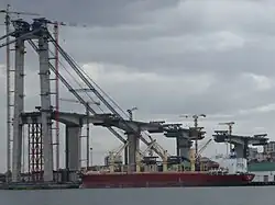 Первоначально опоры также планировались и в самой бухте, но после изменения плана их убрали, чтобы на создавать помех судоходству. Центральный пролёт — 680 м[11] Это делает его самым длинным подвесным мостом в Африке[12]. Каждый из основных поддерживающих тросов соединён прочным анкерным блоком со стальными конструкциями на севере и на юге. Чрезвычайно высокие нагрузки потребовали свайного фундамента диаметром от 1,5 до 2,2 м. Сваи погружены в дно залива на 110 м, высота двух пилонов составляет 141 м, проезжая часть находится на высоте 40 м. Отдельные сборные стальные элементы проезжей части имеют ширину 25,6 м и длину 12 м. Они были изготовлены в Китае и устанавливались с корабля[4].