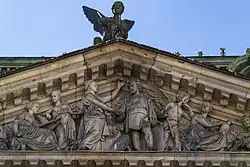Здание завершает антаблемент с архитравом, фризом и карнизом[14] флорентийского типа и балюстрадой[10]. На фризе изображены грифоны, которые держат цепи с мозаичными цветными вставками и медальонами[14], портретами и именами выдающихся деятелей художественного ремесла и прикладного искусства из разных стран и эпох[7]; их сделал А. Г. Бауман. Изображены: Рафаэль Санти, Альбрехт Дюрер, Пинтуриккьо, Тадео и Редерино Цуккери, Жак Картуа, Деларош Поль, Лоренцо Гиберти, Лука делла Роббиа, Петер Фишер, Антонио Филарете, Андре Ленотр, Дюсерсо, Иоганн Бёттгер, Бернар Палисси и Джозайя Уэджвуд[16].