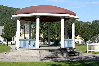 | Вид на Мушёэн с холма Долстад, 29 мая 2005 года | Церковь в Долстаде, январь 2007 года | Павильон в Мушёэне |