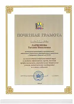 Благодарственное письмо Хабаровской городской Думы[5] |