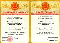 Почётной грамотой Чувашской Республики награждаются граждане, организации, муниципальные образования Чувашской Республики и населенные пункты Чувашской Республики, не имеющие статуса муниципального образования, за большой вклад в развитие экономики, промышленности, агропромышленного комплекса, науки, здравоохранения, образования, культуры, искусства, за достигнутые трудовые успехи и иные заслуги перед Чувашской Республикой и её народом. Нагрудный знак к Почётной грамоте Чувашской Республики носится на правой стороне груди, при наличии государственных наград Российской Федерации, СССР, РСФСР располагается после них. |