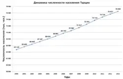 По данным Турецкого института статистики, численность населения страны в 2019 году составляет 83 154 997 человек[3].